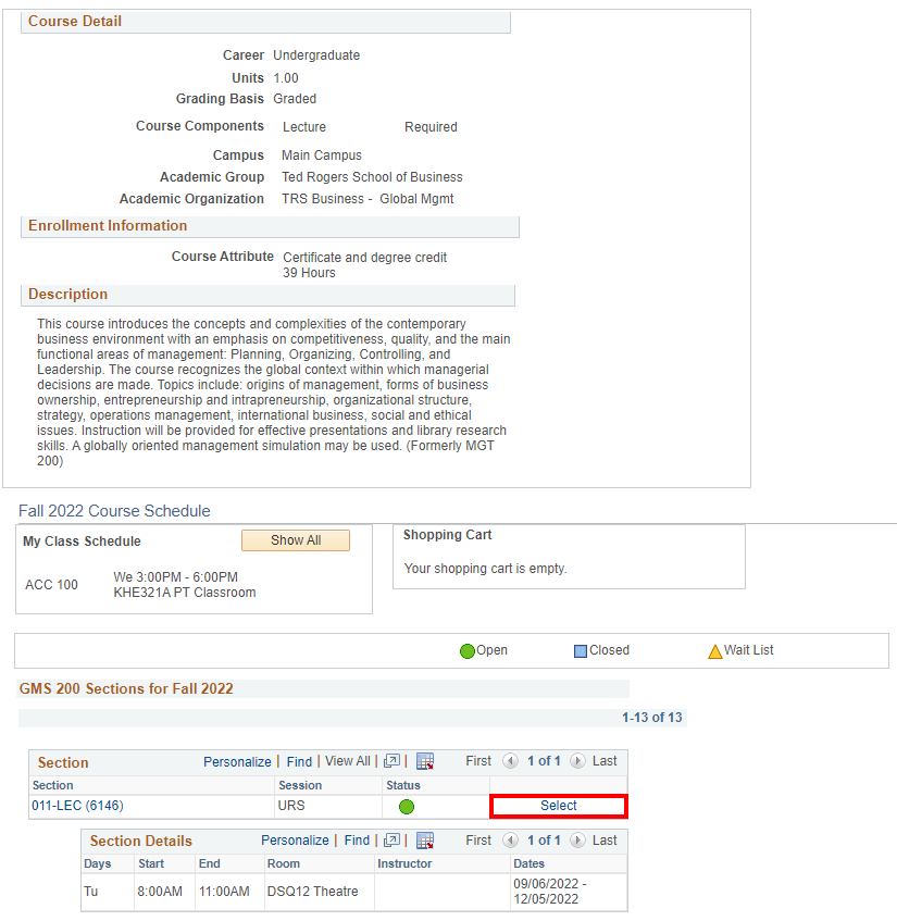 1. Click Select next to the section that is open and best fits your optimal schedule.