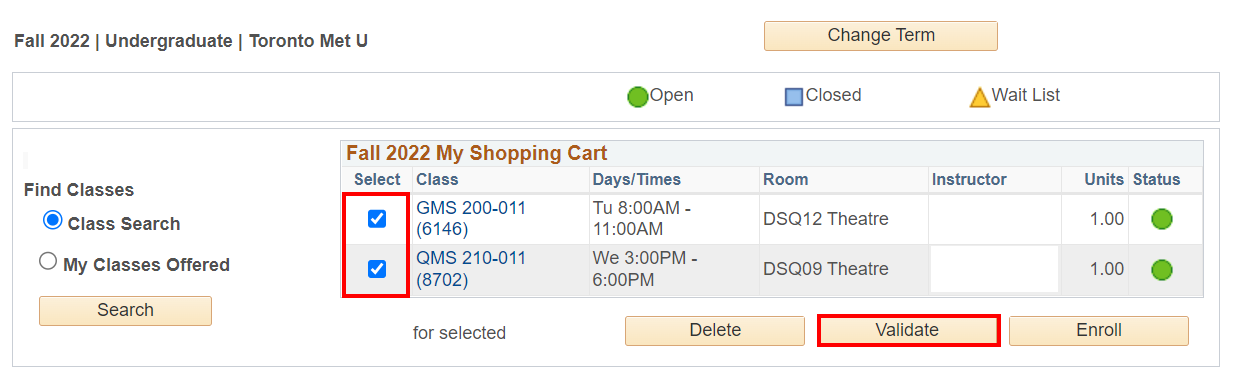 When you have finished building your class schedule and your Shopping Cart contains all the classes you want to enrol in, you are ready to do a validation.