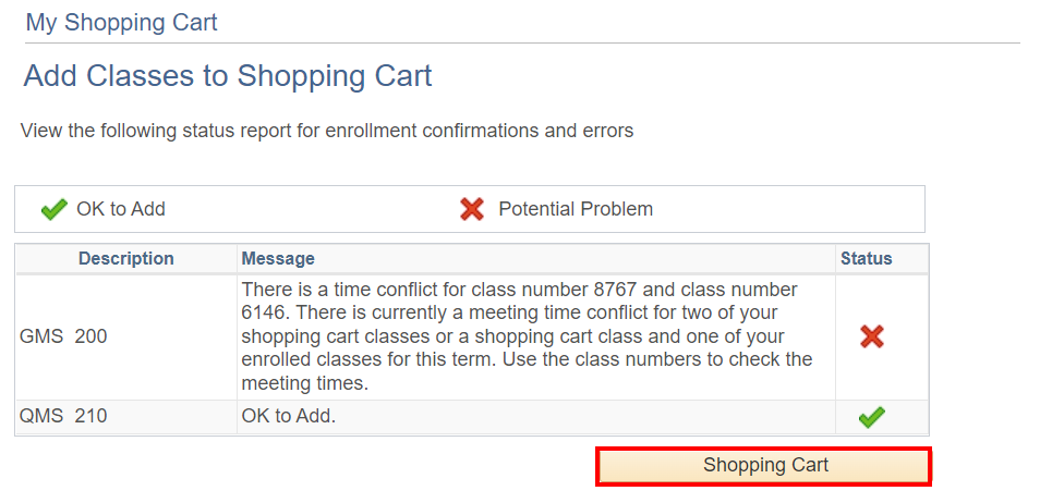 If a class does not validate, you can delete it from your Shopping Cart and add another one. You continue this process until all your selected classes validate successfully.