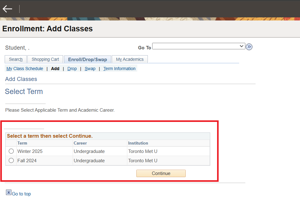 Once you have selected the Visual Schedule Builder hyperlink in the Student Center, navigate to Add Classes and select the appropriate enrolment term.