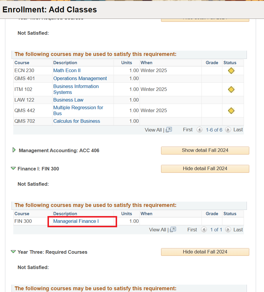 To review the course details, including description, course requirements, and class section information, select the drop-down arrow beside the course title.