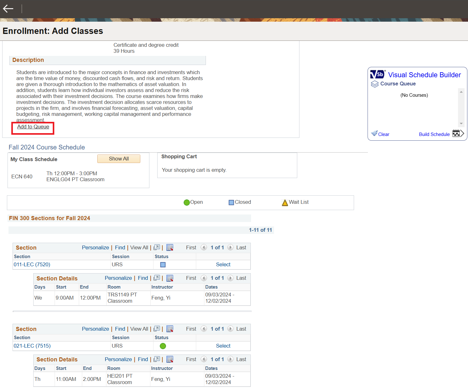 To add it to your course queue, click the Add to Queue hyperlink at the bottom of the course description display.