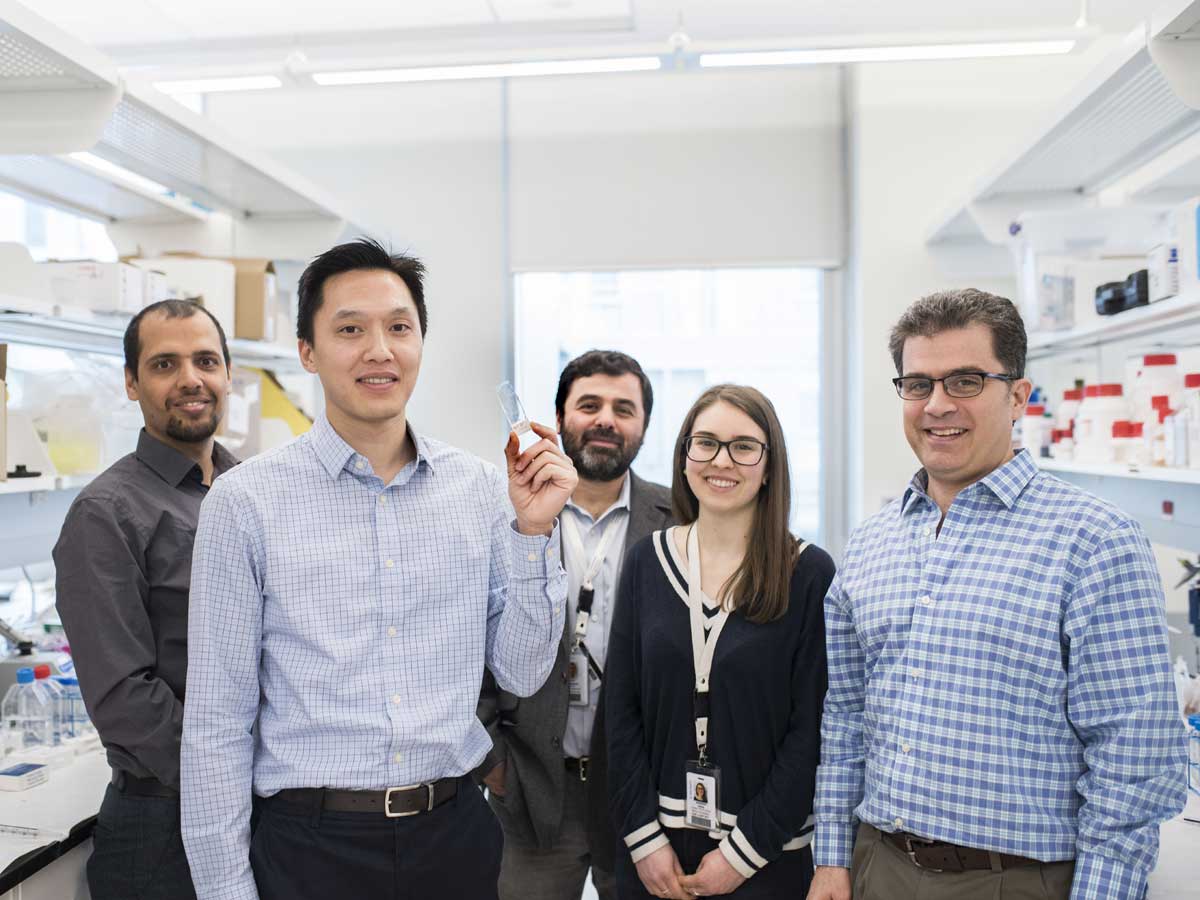 Photo: Scott Tsai demonstrating the microfluidic device developed by research team. From left: Vaskar Gnyawali, Professors Scott Tsai and Raffi Karshafian, Jennifer Kieda and Professor Michael Kolios (not pictured: Byeong-Ui Moon). Photo by Carrie Duncan.