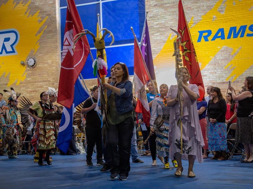 The Grand Entry at the Ryerson Pow Wow 2018 was one of the events that came out of the Truth and Reconciliation community response. Here, Hollee George carries the Two Spirit eagle staff (centre) and Monica McKay carries the Ryerson Eagle staff (right). Photo: Kaytee Dalton.