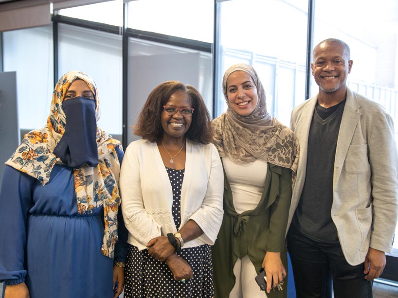 From left: Sakeena Mihar, co-chair of the Muslim Faculty and Staff Community Network; Sarah Bukhari, co-chair of the Muslim Faculty and Staff Community Network; Salma Hindy; and Imam Yasin Dwyer. Photo credit: Mariam Nouser.