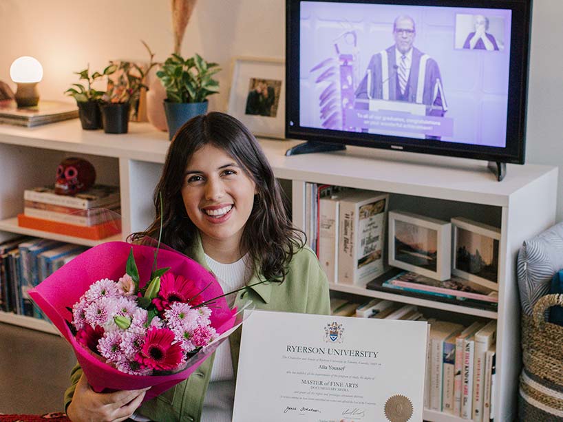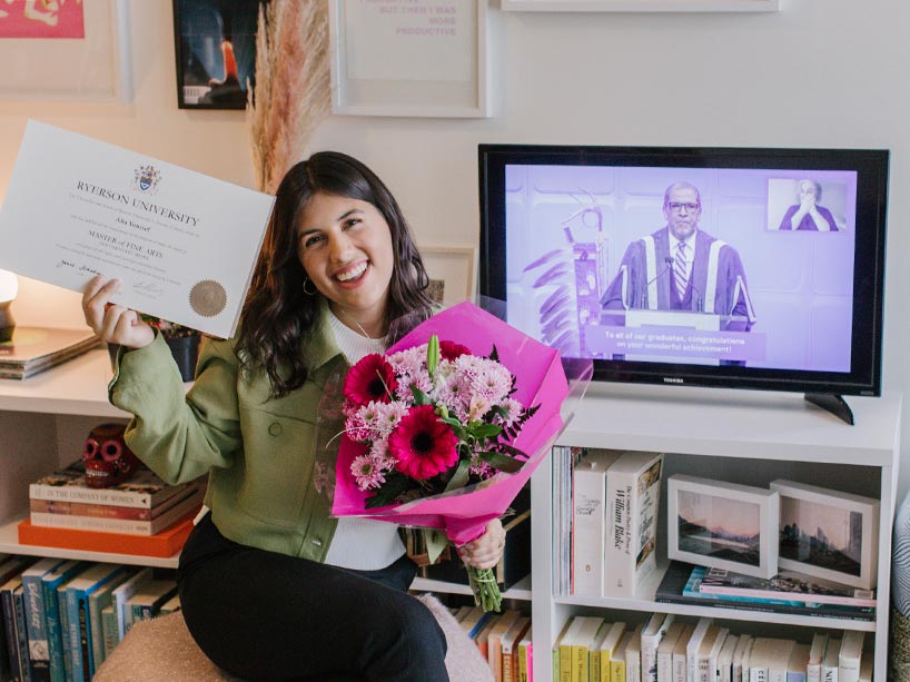 Alia Youssef smiles holding her degree and a bouquet of flowers, with Ryerson’s virtual graduation celebration playing on a screen in the background