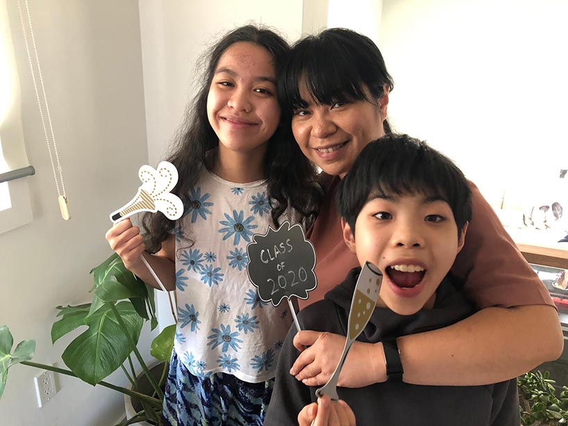 Sze Wan (Kittie) Pang smiles with her arms around her children, who are holding celebration signs