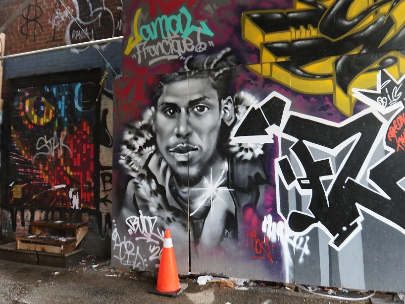This mural, by Bubzlitto Brigante, also in Toronto’s Graffiti Alley, pays tribute to Jamal Francique of Mississauga, Ontario.