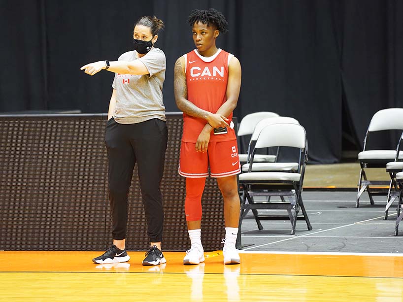 Carly Clarke, left, head coach of the Ryerson Rams women’s basketball team and assistant coach of the 2021 Canadian women’s Olympic team, discusses a play with Team Canada’s Shaina Pellington. (Photo: Matt Walker/Canada Basketball)