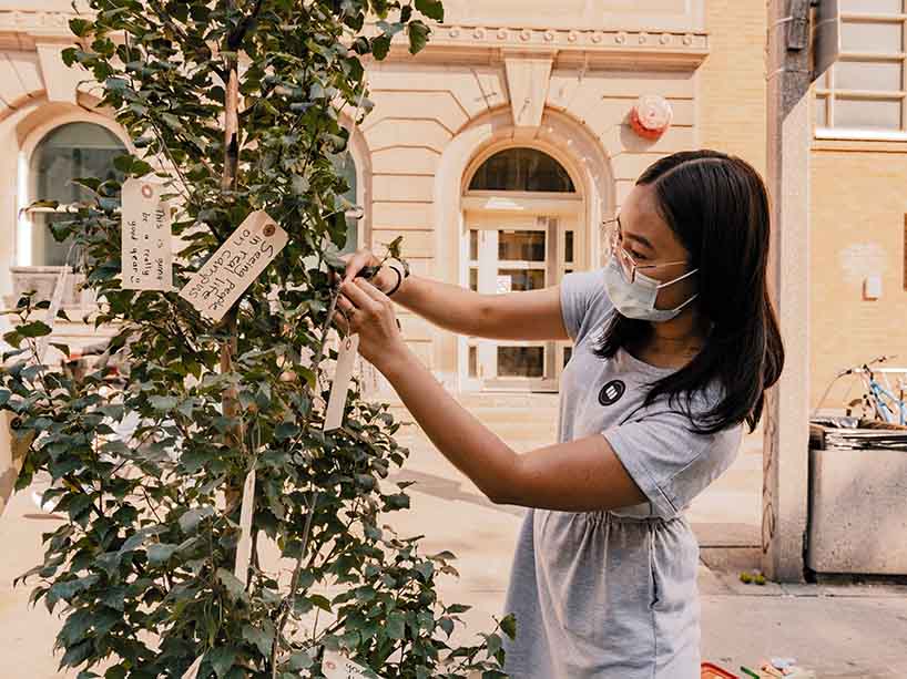 The interactive activation, which turned parking spots into a mini park, included a welcome tree. “We thought it would be a great opportunity to create a space for students and faculty members to meet in person safely and encourage each other through short, written messages hung on the tree,” said Lo. Angela Ng, co-founder of Urban Minds, is pictured hanging a hand-written message.