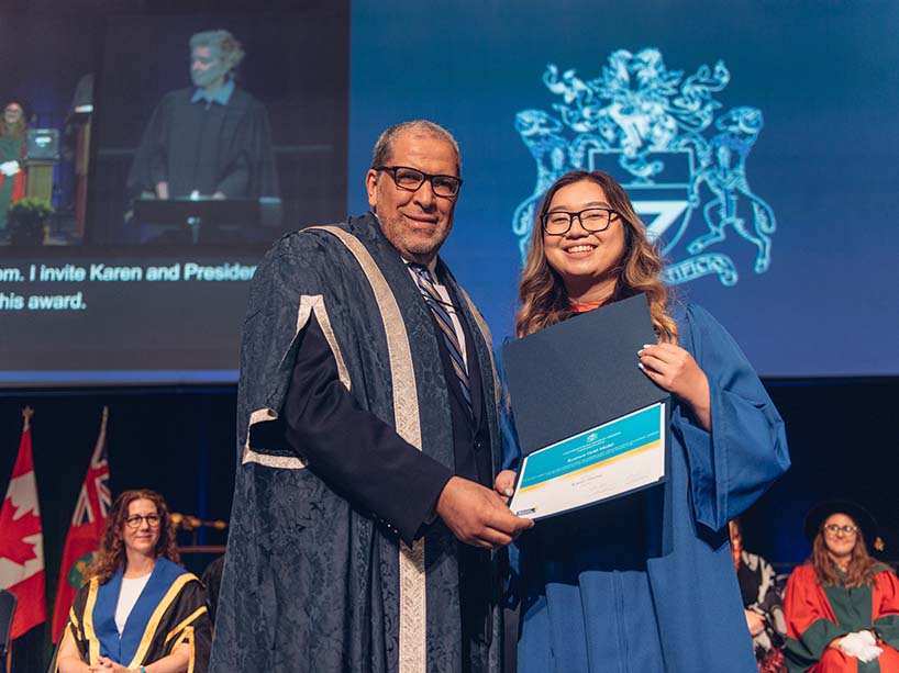 From left, the 2022 Gold Medal recipients are Erica Attard (Mechanical and Industrial Engineering), Julia Caputo (Criminology), Karen Huang (Occupational & Public Health), Allison Mackenzie (Graphics Communication Management), Grejdi Meta (Business Management), Maha Naqi (Mental Health and Addictions) and Julia Pellegrino (Chemistry and Biology)