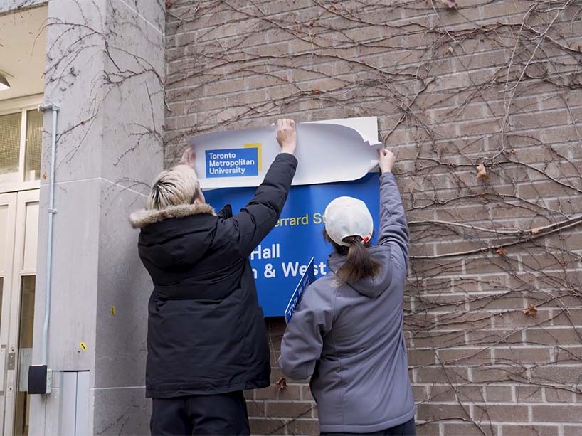 With the adoption of the new name, the university recommits to its core values and aspirations. The student sign installers feel their proactive efforts make them an integral part of TMU ‘s next chapter. “It's official. We're TMU now,” says Wong.