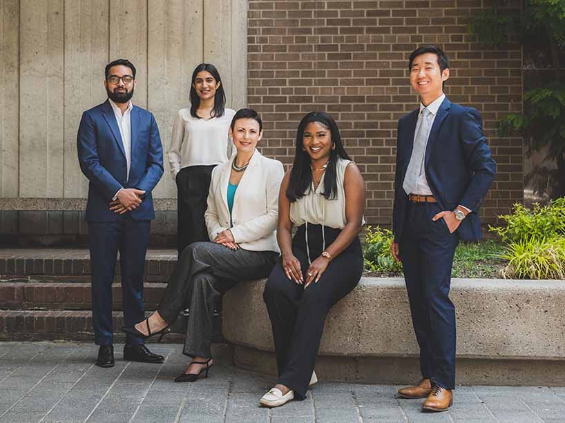 The first graduates of the Lincoln Alexander School of Law are excited to enter the workforce with a unique set of skills. From left: Arshad Auckbarallee, Ridhey Gill, Oksana Romanov, Shanté Brown and Leo Cho. Photo credit: Jae Yang