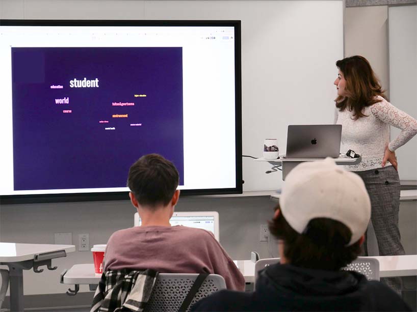 The presentation screens on each wall can be used by both instructors and students to share presentations or activities. Pictured here is a student sharing her work with the rest of the class. Photo credit: Santiago Sanz