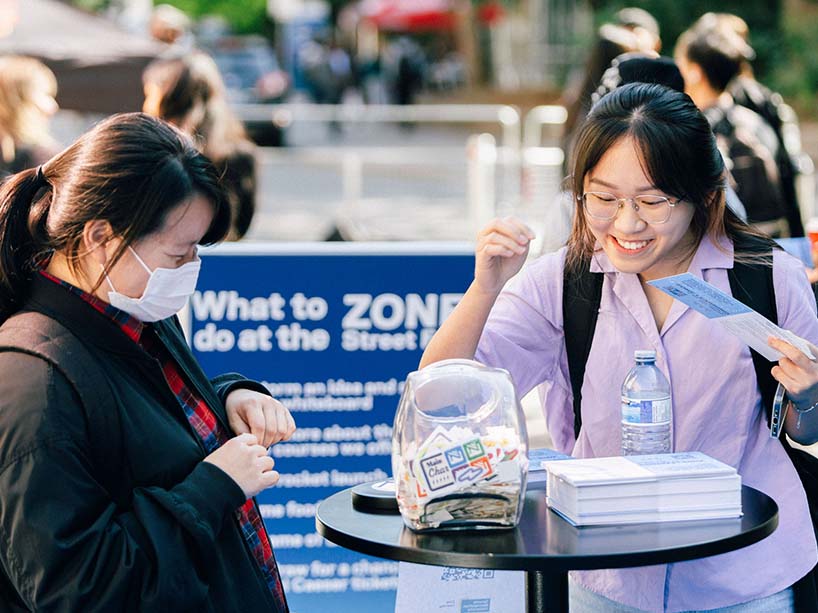 Two attendees get excited for stickers and BINGO at the Zone Street Fair.
