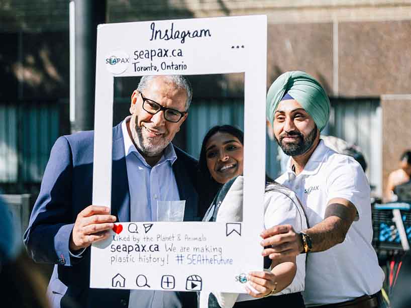 TMU President Mohamed Lachemi, left, smiles for a photo in a life size Instagram photo frame with Seapax co-founders Riya Aggarwal and Karan Singh. (The third co-founder, not pictured, is Charles Anate). The startup is part of the Science Discovery Zone.