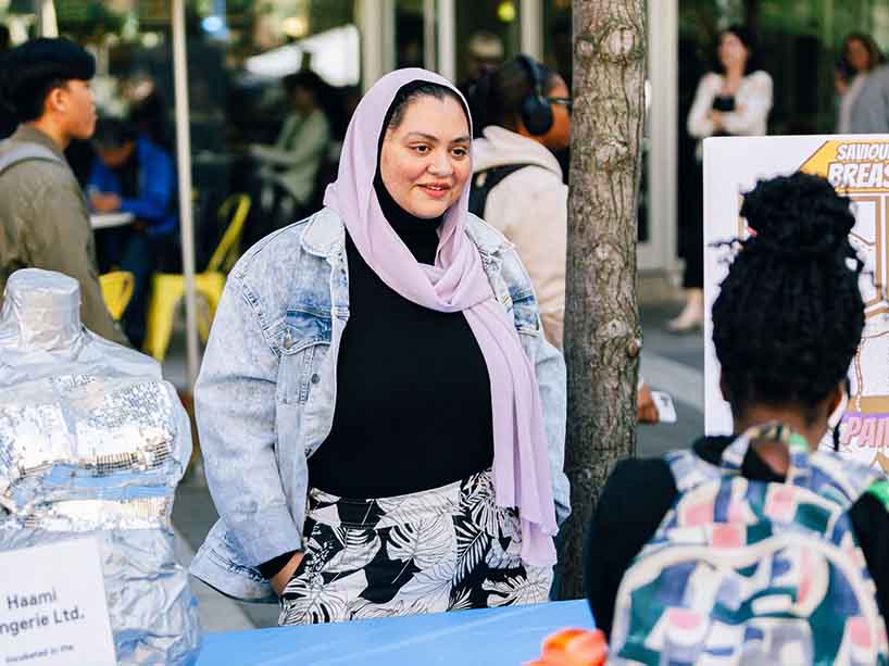 Haami Lingerie founder Faria Jafri talks to students about her startup, which is incubated in the Fashion Zone.