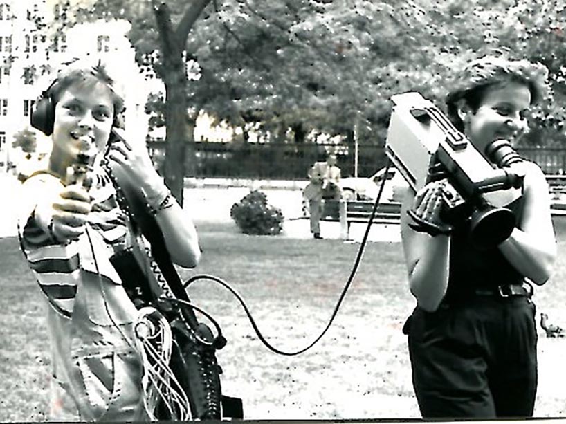 An archival image of professor Marusya Bociurkiw from behind the camera with Emma Productions.