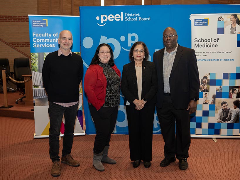 Leadership from both TMU and the Peel District School Board, pictured here (from left - Kiaras Gharabaghi, dean, Faculty of Community Services; Dr. Teresa Chan, founding dean, School of Medicine; Rashmi Swarup, director of education, Peel District School Board; and David Green, executive director, Peel District School Board), were on-hand to announce the Future of Healthcare Initiative last December.
