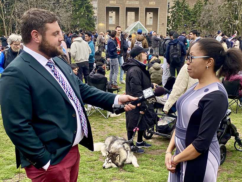 CBC Toronto’s Chris Glover interviews a group of young students at TMU’s Solar Eclipse Watch Party.