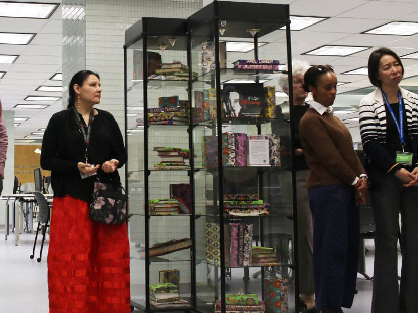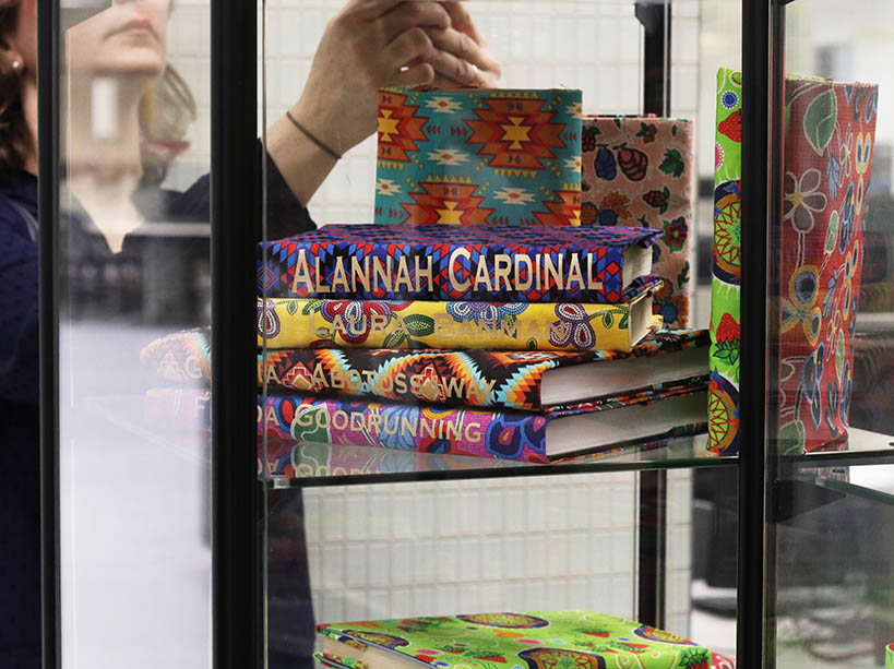 The books in the micro gallery were wrapped by students, staff and librarians during book wrapping events in March at the Libraries’ Digital Media Experience Lab. Some of the books were marked with the names of missing and murdered Indigenous women and girls printed in gold on the spine.