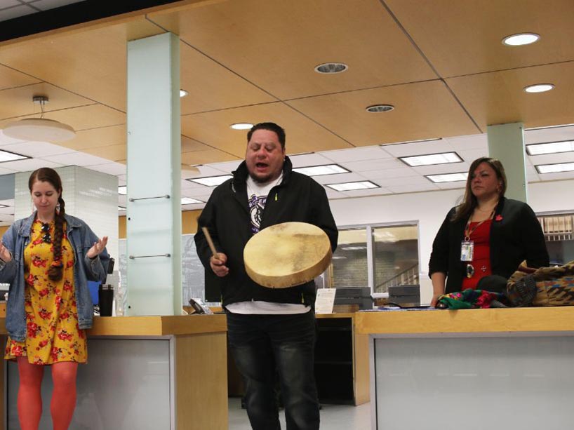 Wayne Moberly (centre) opened the micro gallery exhibit with an honour song. Crystal Osawamick (right), noted the importance of balance and included men on this day to raise awareness and honour the many men that have also gone missing and been murdered.