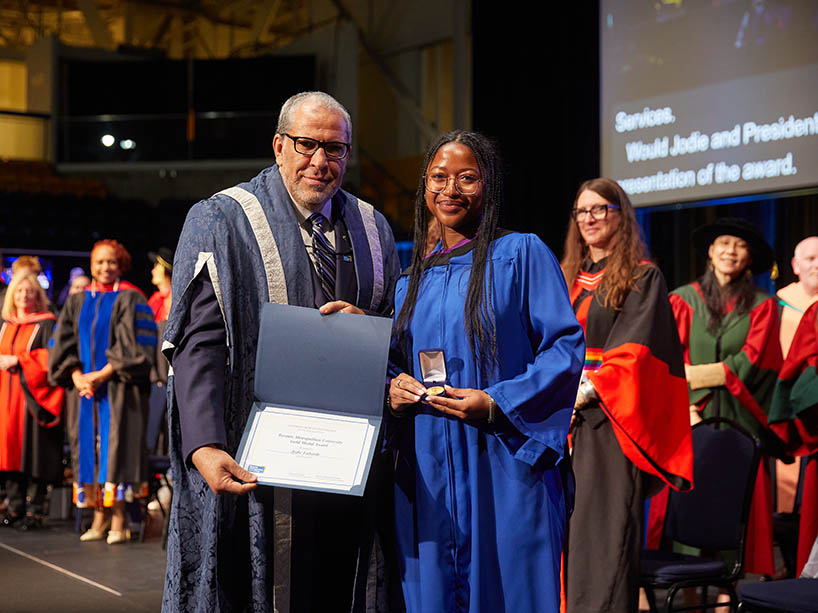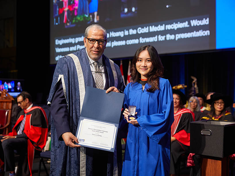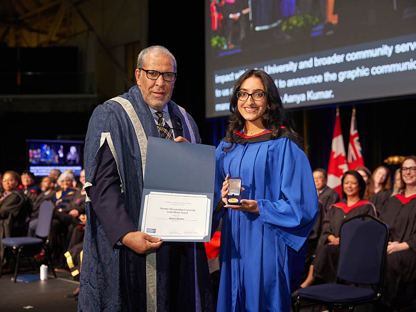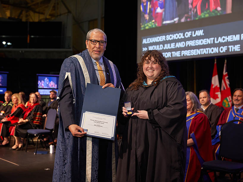 TMU President and Vice-Chancellor Mohamed Lachemi (left) presents the Gold Medal Award to student Jodie Laborde. The Gold Medal is TMU’s highest honour, awarded to students with outstanding academic achievement and exceptional involvement in the university, their profession, and their community. Photo by Harry Choi.