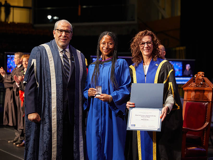 Faculty of Community Services graduate Jodie Laborde (centre), with Board of Governors Vice Chair Catherine Paisley (right), was awarded both the Gold Medal Award and the Board of Governors Leadership Award. Photo by Harry Choi.