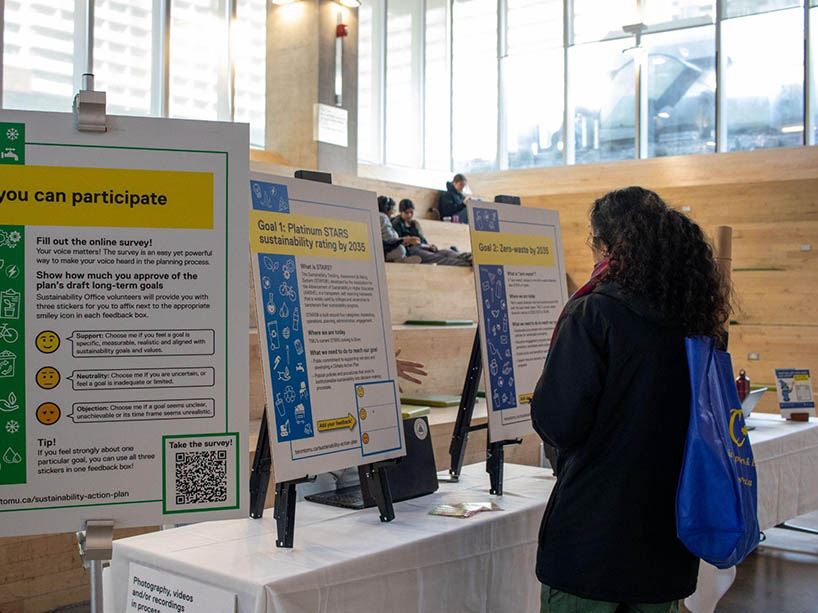 A community member reviews the Sustainability Action Plan goals at a community consultation. The plan lays out realistic, inclusive and reflective goals that align with the TMU community’s needs and values.