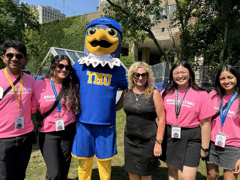 Johannah Alilio, second from right, with fellow members of the TMU orientation team, along with Frankie the Falcon, and beside her, at centre, Roberta Iannacito-Provenzano, the university’s provost and vice-president, academic.