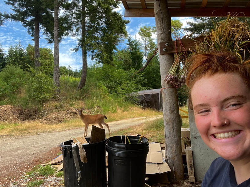 Mac Clarke, right, takes a selfie on a Salt Spring Island farm, where she says baby fawns and young bucks “love to eat our compost”. (Photo: Mac Clarke)