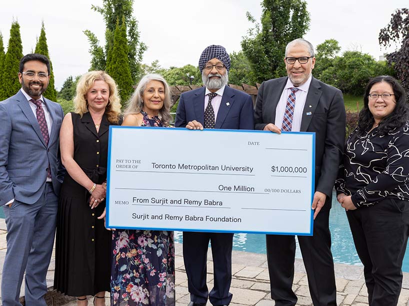 From left: Krishan Mehta, vice-president, university advancement and alumni relations; Roberta Iannacito-Provenzano, provost and vice-president, academic; Remy Babra, Surjit Babra, chairman and CEO, SkyLink Capital Corp.; Mohamed Lachemi, president and vice-chancellor; and Dr. Teresa Chan, dean, School of Medicine and vice-president, medical affairs.