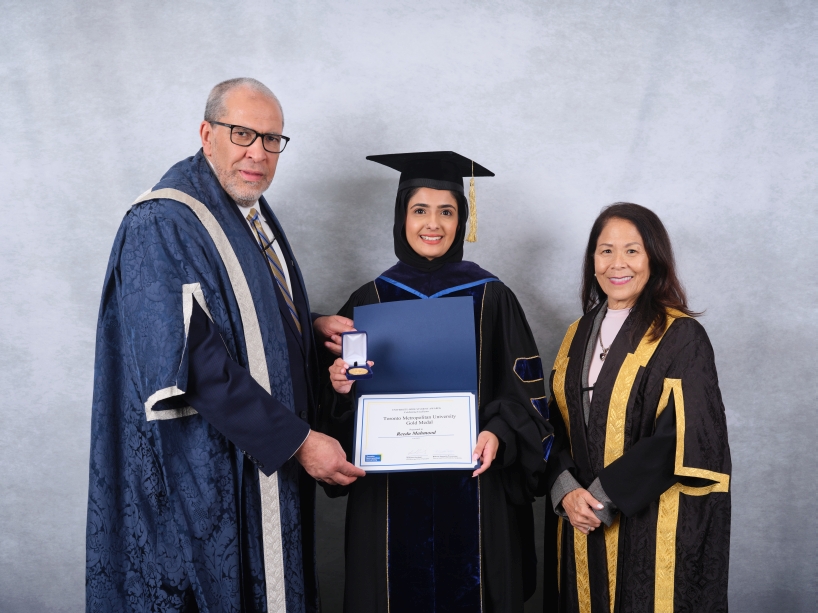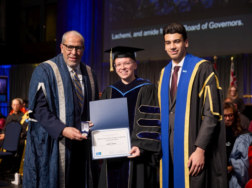 Graduate Amber Grant (centre) accomplished a wide range of personal and academic achievements during their PhD studies at TMU. They include earning the Board of Governors Leadership Award, presented here by President Lachemi (left) and Board of Governors student representative Ahmed Elshahed (right).