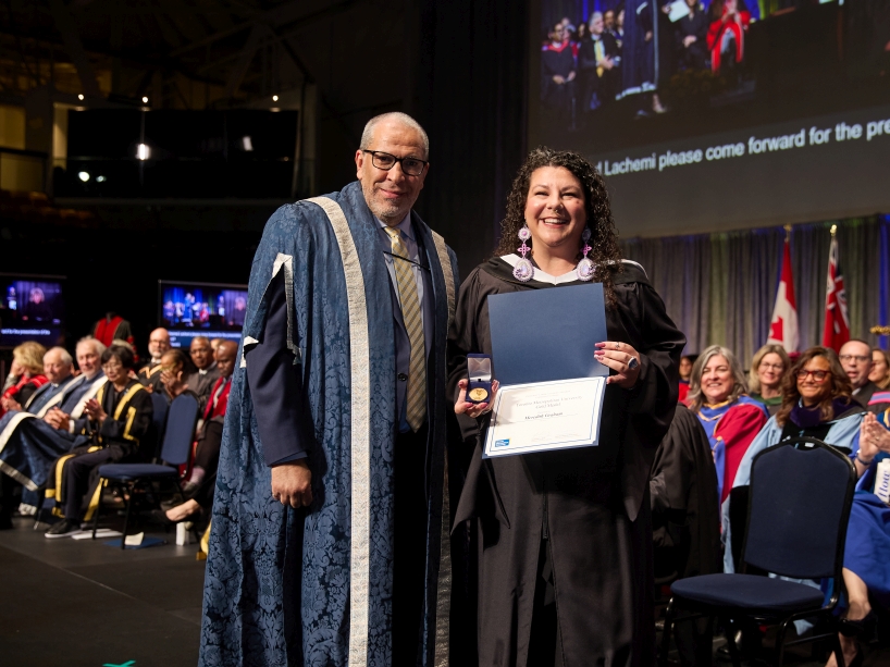 Toronto Metropolitan University President Mohamed Lachemi presents PhD graduate Amber Grant with the Gold Medal Award at convocation. The Gold Medal is TMU’s highest honour. Photos by Harry Choi.