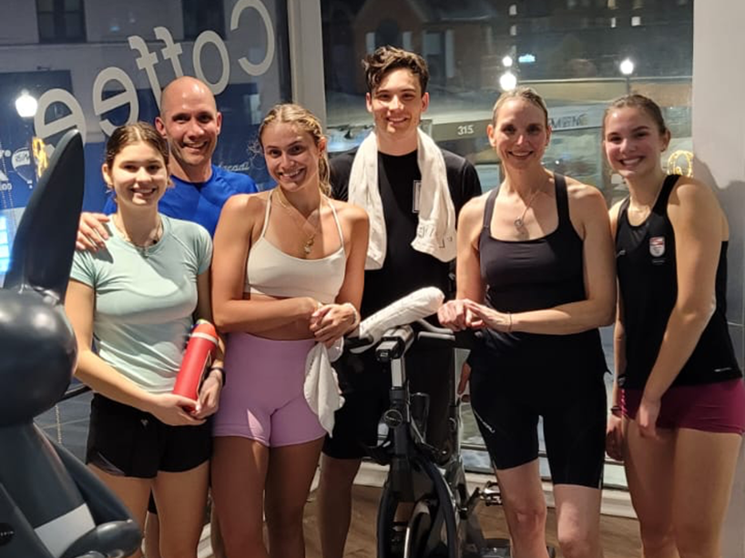 Jojo Chiarotto, 23, a fourth-year TMU psychology student, is seen above (front row, second from left in pink shorts) at a spin class with her boyfriend and his family. Chiarotto says being physically active gives her the energy and focus she needs to tackle the day. (Photo courtesy of Jojo Chiarotto).