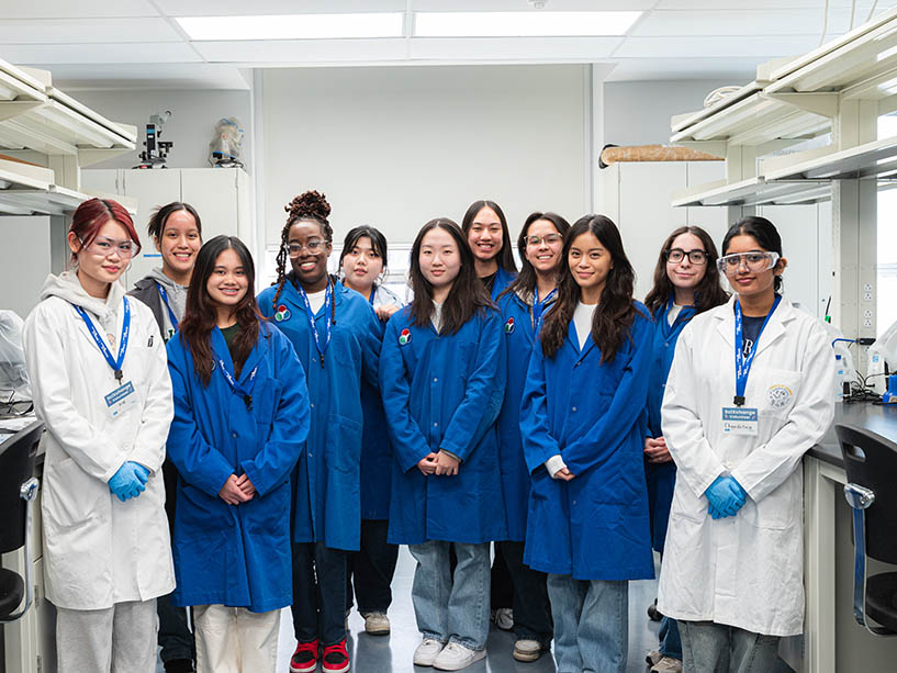 Above, at the first DNA Fingerprinting lab at TMU on March 17, in white lab coats, TMU science student volunteers Xia Huynh and Chandrima Bhowmick at far left and far right. Joining them are students from Toronto high school St. Joseph’s College, from left to right, Juliane-Marie Lopez, Mia Maningo, Bianka Descartes, Chloe Jin, Yoonsuh Kang, Kera Alforque, Jayda Lozano, Lyca Panaga, Kayla Caputo. (Photo: Sarah McIntyre)