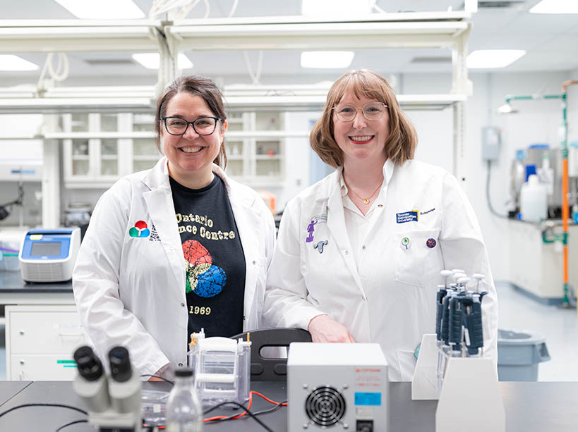 Jennifer O’Leary, Team Lead, School Programs, Ontario Science Centre, left, and Leigh Paulseth, science outreach and enrichment coordinator at TMU’s SciXchange, pose in the new lab at TMU for the grade 12 biology class, DNA Fingerprinting. (Photo: Sarah McIntrye)