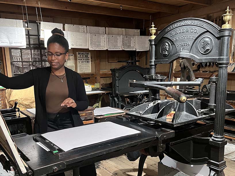 Janelle Brady standing behind a print press in the Mackenzie House.