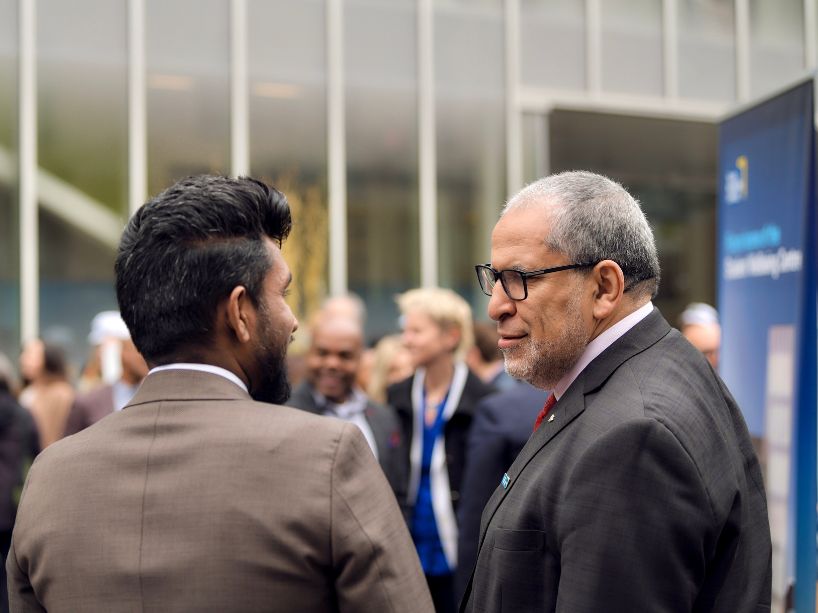 President and Vice-Chancellor Mohamed Lachemi (right) speaks with Hon. Vijay Thanigasalam, Associate Minister of Mental Health and Addictions, Ontario, who was onsite to mark the official groundbreaking for TMU’s Student Wellbeing Centre. (Photo: Alyssa K. Faoro)