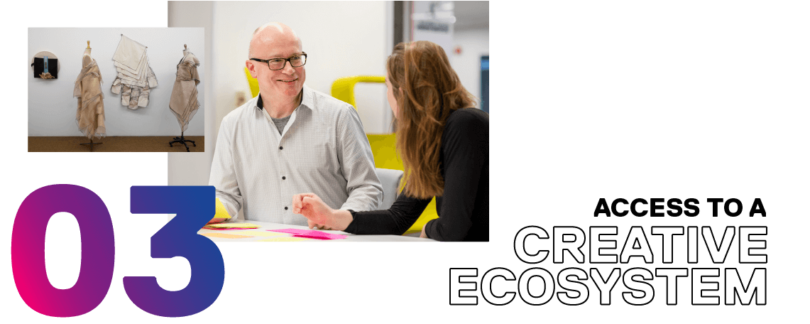 The program offers tremendous flexibility for students to explore all areas of the creative industries — from practicing and planning to prototype — while tapping into a broad base of expertise. Successful applicants will create and disseminate in their chosen creative medium, as well as produce a written analysis of their research project. Students can collaborate with industry professionals and explore emerging technologies in their fields.