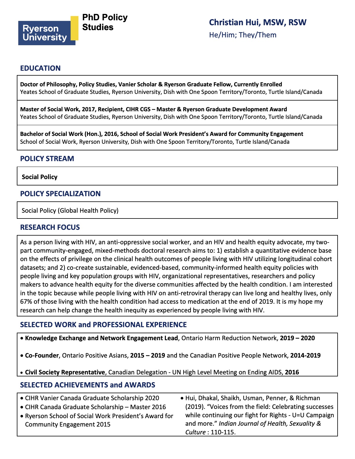 Christian Hui, MSW, RSW (he/him) is a settler living with HIV, an HIV and harm PHOTO reduction advocate, a community mobilizer, a registered social worker, a CIHR Canadian HIV Trials Network Community Advisory Committee Member, a Canadian Foundation for AIDS Research (CANFAR) Ambassador, and a CIHR Vanier Canada Graduate Scholar. He is an international steering committee member of the Undetectable=Untransmittable (U=U) Campaign, and a co-founder of two independent networks of people living with HIV: Ontario Positive Asians and the Canadian Positive People Network. He served on the Canadian Delegation at the 2016 UN High Level Meeting on Ending AIDS in 2016, and was awarded the Ontario AIDS Network Person Living HIV/AIDS Leadership Award in 2017. Christian’s doctoral research aims to demonstrate the impact of privilege on the clinical health outcomes of people living with HIV, and to co-create a sustainable Positive Health Equity Action Plan through the meaningful engagement of people living with HIV and members from key population groups, along with organizational representatives, researchers and policy makers. His academic interest includes bridging qualitative, quantitative and community-led research approaches and methodologies to inform the development of global health and social policies to advance equity for communities oppressed by neo-colonial policies.