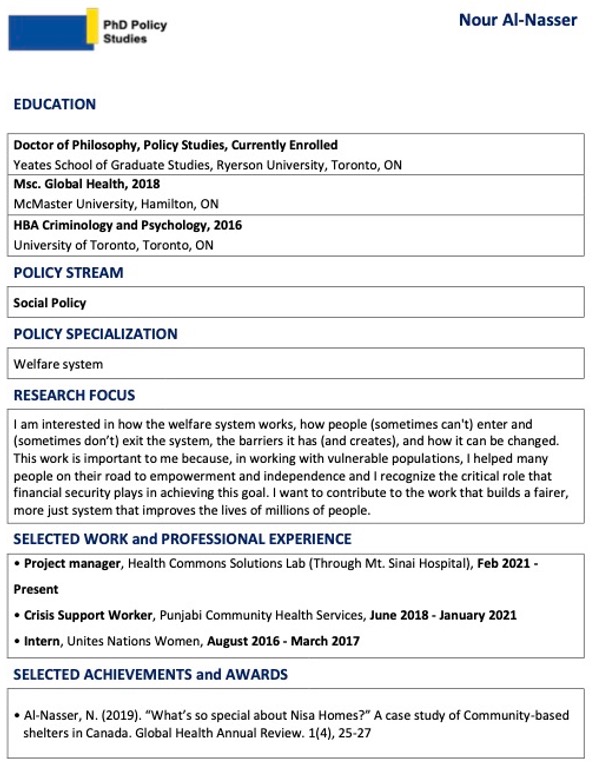 Nour Al-Nasser is a PhD student in the social policy stream of the Policy studies program at Ryerson University. She currently works on the community-led COVID response and vaccine strategy at Mt. Sinai hospital. Prior to this work, Nour worked extensively with vulnerable and marginalized communities in Canada, and abroad - with a focus on health equity, mental health, domestic violence, and financial support. Nour is interested in the welfare system and the ways it can be enhanced - or re-imagined. Upon completing her studies, she hopes to advocate for change in the welfare system and have the tools and expertise to do so.