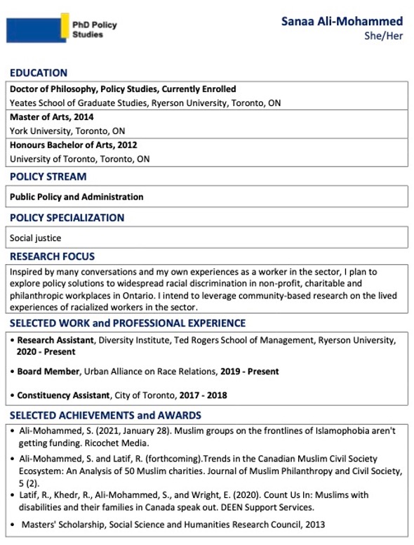 Sanaa Ali-Mohammed is a current Policy Studies PhD student in the Public Policy Stream at Ryerson University. Sanaa brings nearly ten years of advocacy, program design and coordination experience in the public policy, non-profit and philanthropic worlds. In 2018 and 2019, Sanaa collaborated with over a hundred community organizations to encourage elected leaders to pass policies declaring a Day of Remembrance and Action on Islamophobia in the City of Toronto and Province of Ontario, respectively. Sanaa has contributed to conversations about systemic Islamophobia and racial discrimination in the non-profit and philanthropic sectors through publications for the Philanthropist Journal, Community Centric Fundraising, and Ricochet Media, among others, and has conducted research on Muslims with disabilities in Canada, as well as on spiritually motivated philanthropy. Sanaa plans to study how public policy can address the gap between non-profit and philanthropic organizations' external commitments to addressing racial discrimination on the one hand, and internal policies, practices and cultures which often enable racial discrimination on the other.