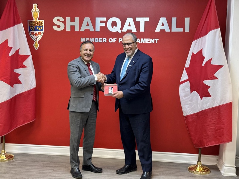 President Mohamed Lachemi receives the King Charles III Coronation Medal from Member of Parliament Shafqat Ali, recognizing President Lachemi’s role in collaboration between higher education and government.