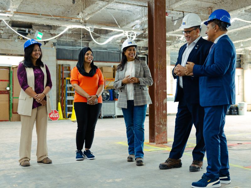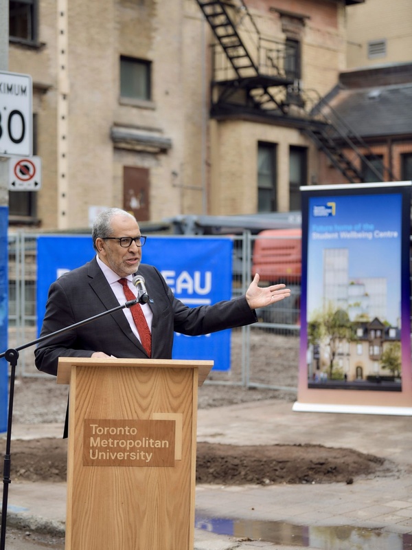 President Lachemi speaks at the groundbreaking ceremony for TMU’s future Student Wellbeing Centre; an important step in expanding student support services.