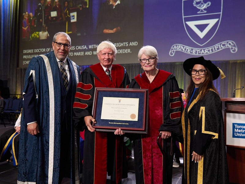 President Mohamed Lachemi confers an honorary degree to Maria and Walter Schroeder during TMU’s convocation ceremony, celebrating their philanthropic contributions to society.