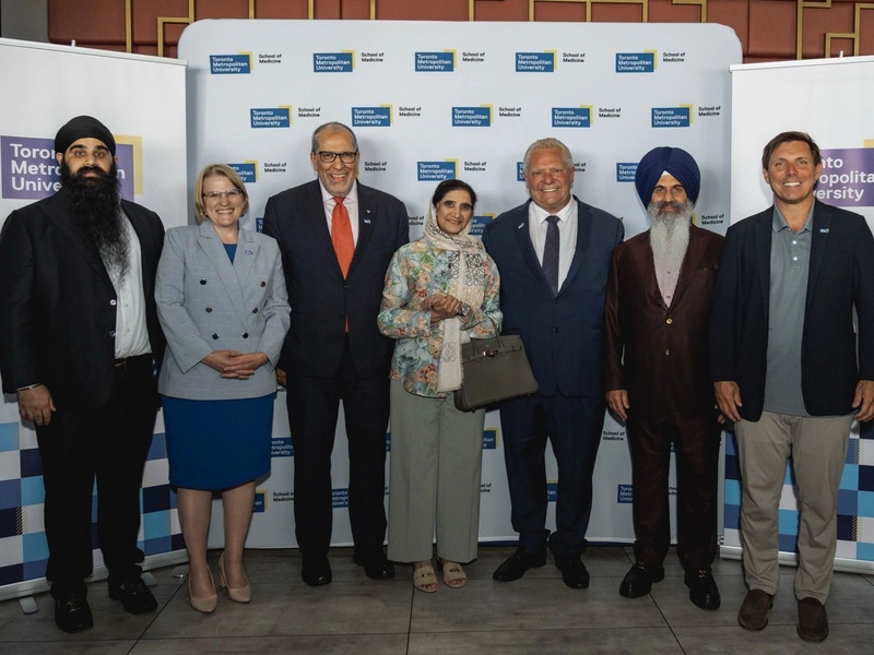 TMU President Mohamed Lachemi is joined by Premier Doug Ford, Brampton Mayor Patrick Brown and members of the Dhillon family, in celebrating the family’s generous gift to the School of Medicine.