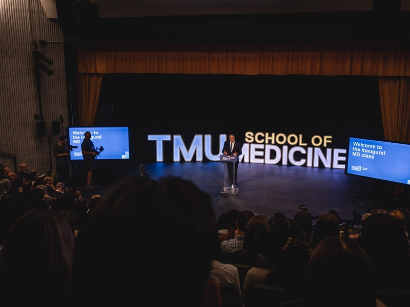 President Mohamed Lachemi stands with TMU senior leadership at the launch event for the School of Medicine’s Post Graduate Education program.