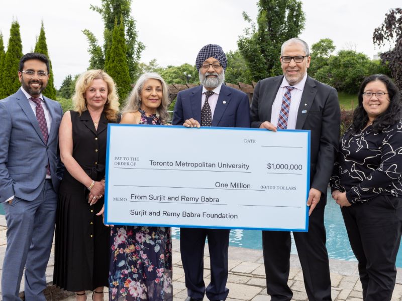 With Krishan Mehta, vice-president, university advancement and alumni relations; Roberta Iannacito-Provenzano, provost and vice-president, academic; Remy Babra, Surjit Babra, and Dr. Teresa Chan, dean, School of Medicine and vice-president, medical affairs in recognition of a $1 million gift from the Babra family.