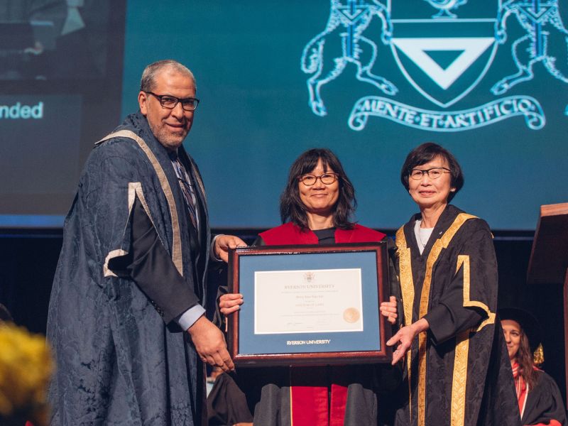 President Mohamed Lachemi (left) and Chancellor Janice Fukakusa C.M. (right) present honorary doctorate to Justice Avvy Yao-Yao Go (centre) at TMU's spring 2022 convocation.